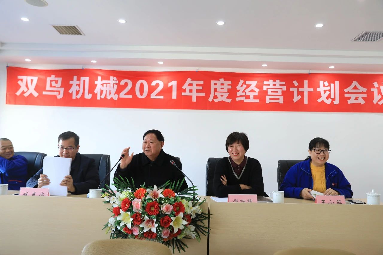 百年雙鳥,夢想啟航。2021年1月9日,浙江雙鳥機械有限公司2021年經營計劃發布大會在雙鳥數碼會議中心隆重召開。公司組長以上干部、工程師職稱、技師資格以上人員、獲市級以上榮譽人員及2020年參加健峰集訓人員等,共計百余人參加會議。集團和公司領導張文忠、張麗萍、盛嘉慶、黃文勝、王小英出席。集團公司張文忠董事長作重要講話,盛嘉慶總經理作年度主旨發言。會議由人事行政部經理黃蔣平主持。
