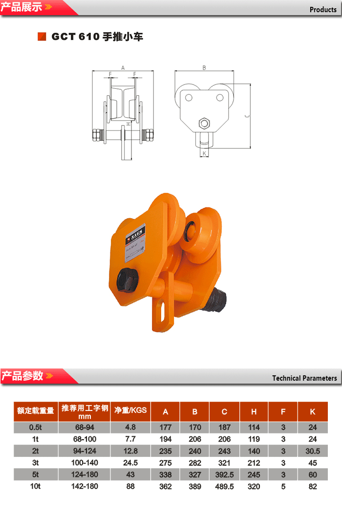 常規(guī)型手推小車 GCL/GCT810系列小車選用了全新的高強(qiáng)度低合金結(jié)構(gòu)鋼,確保4倍安全載荷,輕巧、安全、安裝方便、是目前最為輕巧小車之一。 1.采用優(yōu)質(zhì)鋼材,結(jié)構(gòu)緊湊,外型美觀。 2.國(guó)際標(biāo)準(zhǔn)生產(chǎn),安全性能可靠。 3.可多種選擇,“H”型鋼、“I”型鋼均可適用。